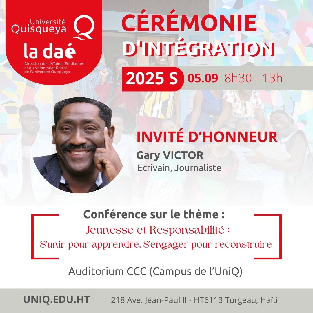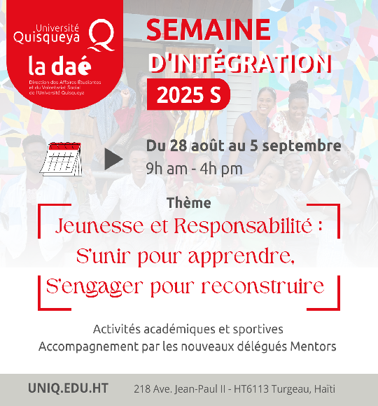 À l’occasion de la Semaine d’intégration 2025S, l’Université Quisqueya souhaite valoriser le rôle stratégique des jeunes dans la construction d’une société inclusive, équitable et durable. Les étudiants sont appelés à devenir les leaders, penseurs et innovateurs de demain. Leur engagement est essentiel pour affronter les grands enjeux de notre époque.