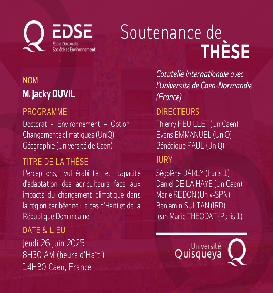 Titre de la thèse : "Perceptions, vulnérabilité et capacité d'adaptation des agriculteurs face aux impacts du changement climatique dans la région caribéenne : le cas d'Haïti et de la République Dominicaine."